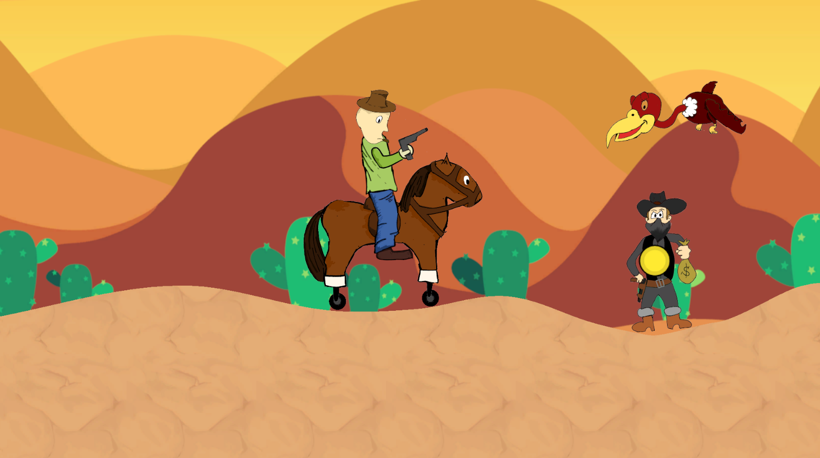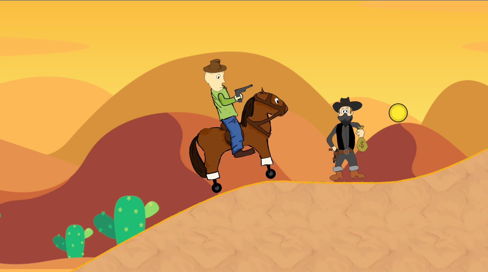 Ride into the Wild West on your rolling horse in this fast-paced 2D physics-based adventure inspired by Hill Climb Racing. Balance your speed and control as you dodge deadly vultures, take down outlaws, and avoid flipping over on rough terrain. Use simple controls—A/D or arrow keys to move and left-click to shoot—as you fight your way to the saloon. I woul'd really aprecate some feedback in the comments.